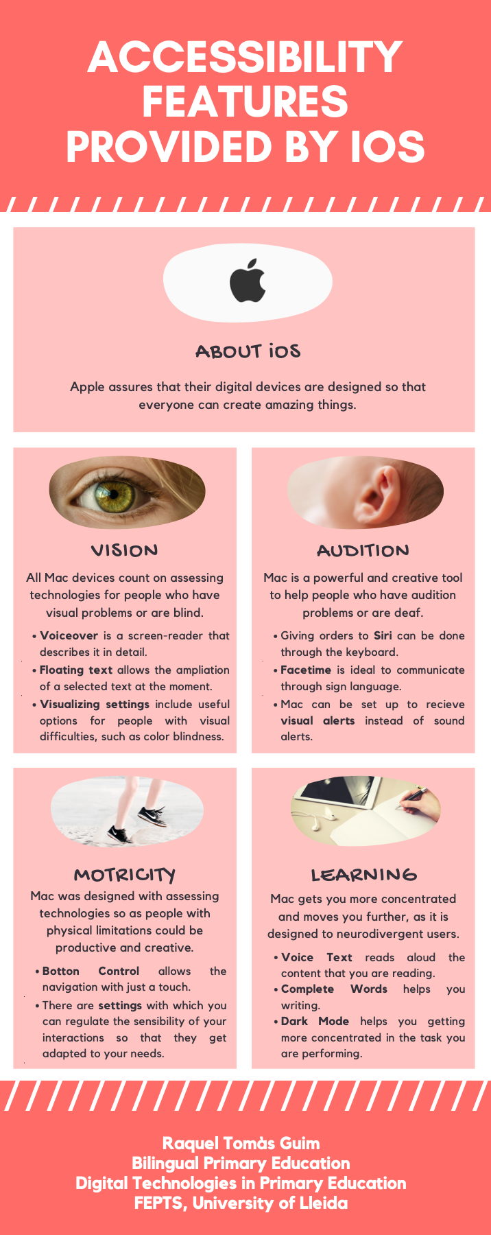 Trough the use of "Canva", I have created this inphographics that shows the accessibility features provided by iOS, the operating system I use. It includes a brief introduction of iOS, a brief explanation of what Apple considers about each aspect and, finally, the resources that Mac devices include to ensure that people with any kind of difficulties or disabilities can use them.